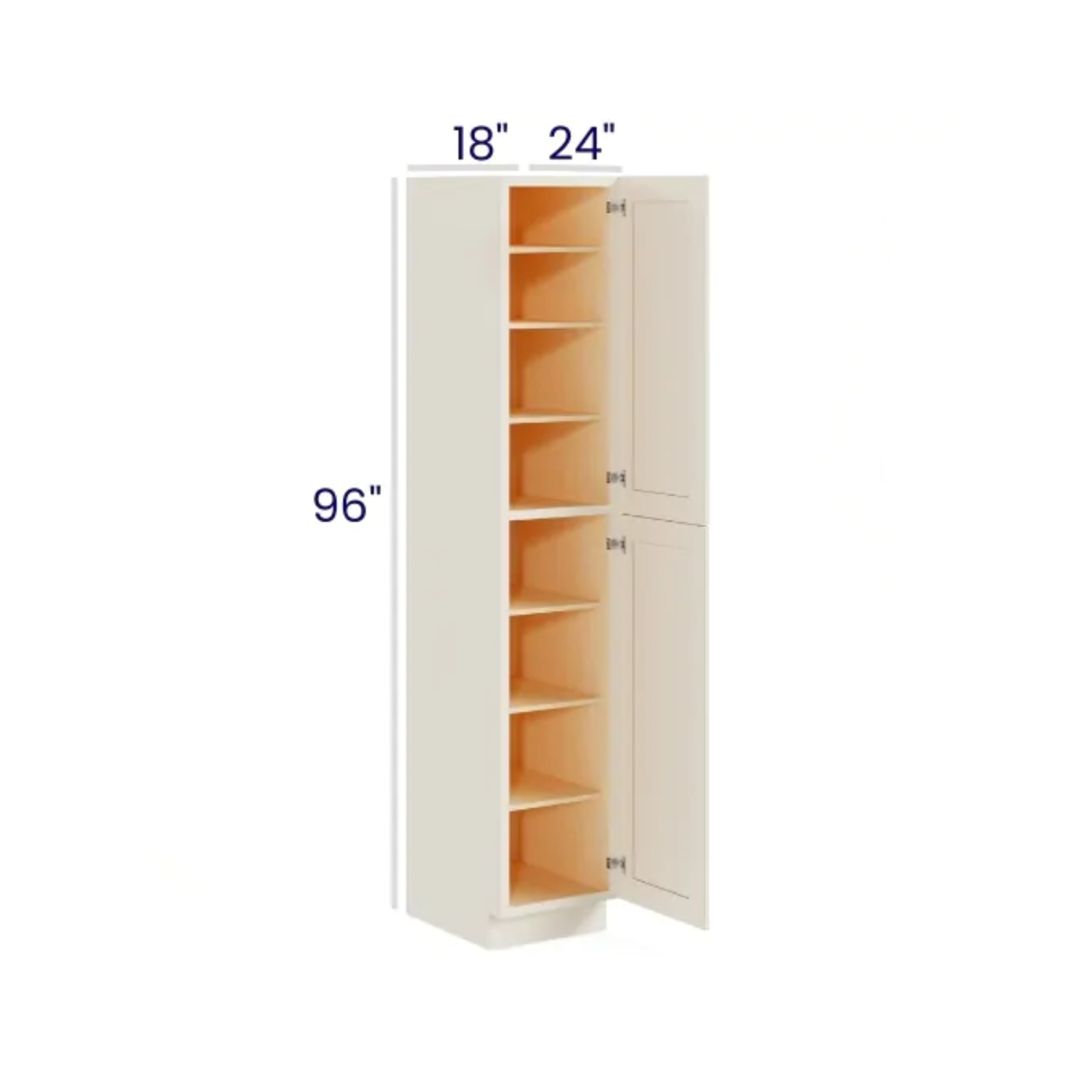 Charleston White – Utility Pantry – 18″W X 24″D X 96″H. Two Adjustable Top Shelves, Three Bottom Shelves. Note: Roll Out Shelf Kits Available.