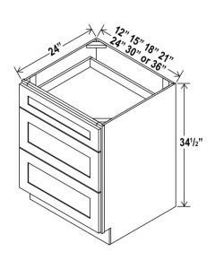 Cabinet Dimensions: 12″W x 34-1/2″H x 24″D, 15″W x 34-1/2″H x 24″D, 18″W x 34-1/2″H x 24″D, 21″W x 34-1/2″H x 24″D, 24″W x 34-1/2″H x 24″D, 27″W x 34-1/2″H x 24″D, 30″W x 34-1/2″H x 24″D, 33″W x 34-1/2″H x 24″D, 36″W x 34-1/2″H x 24″D. Many shoppers searching for a White Shaker 3 Drawer Base appreciate having so many size options.